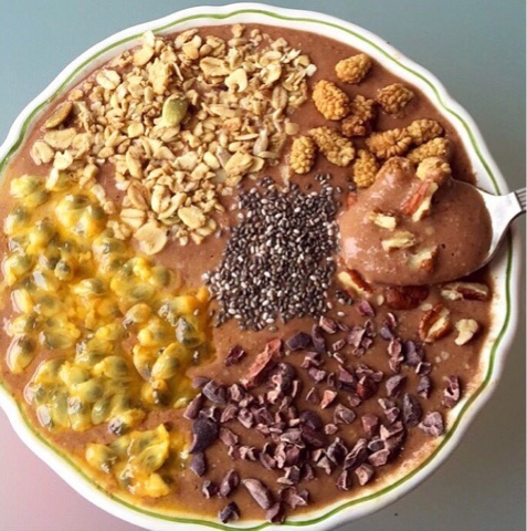 Whizz up all ingredients in a blender, pour into a bowl and top with fresh fruit, nuts and granola.